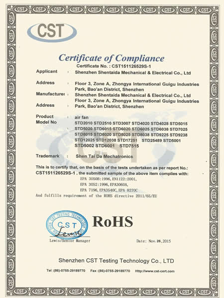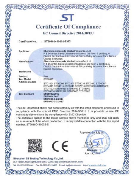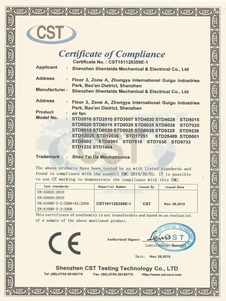 專注定制通風(fēng)散熱風(fēng)機(jī)整套解決方案 深圳市深臺(tái)達(dá)機(jī)電有限公司是一家專業(yè)研發(fā)、生產(chǎn)直流、交流散熱風(fēng)扇、鼓風(fēng)機(jī)、EC風(fēng)扇等通風(fēng)散熱風(fēng)機(jī)產(chǎn)品的公司。來自我國(guó)資深的高級(jí)工程師研發(fā)設(shè)計(jì),擁有一流的研發(fā)中心,采用全自動(dòng)電腦測(cè)試儀,自動(dòng)繞線機(jī)等先進(jìn)生產(chǎn)和檢驗(yàn)設(shè)備,生產(chǎn)基地位于廣東東莞鳳崗鎮(zhèn),產(chǎn)品應(yīng)用于5G通訊,汽車充電樁,充電樁模塊,無人機(jī),電磁加熱,高低壓變頻器設(shè)備、伺服與傳動(dòng)設(shè)備,UPS不間斷電源,通訊設(shè)備,激光設(shè)備,醫(yī)療設(shè)備,醫(yī)療器械,空氣凈化器,電焊機(jī),電源系統(tǒng)/電力設(shè)備,除濕除臭設(shè)...CERTIFICATE